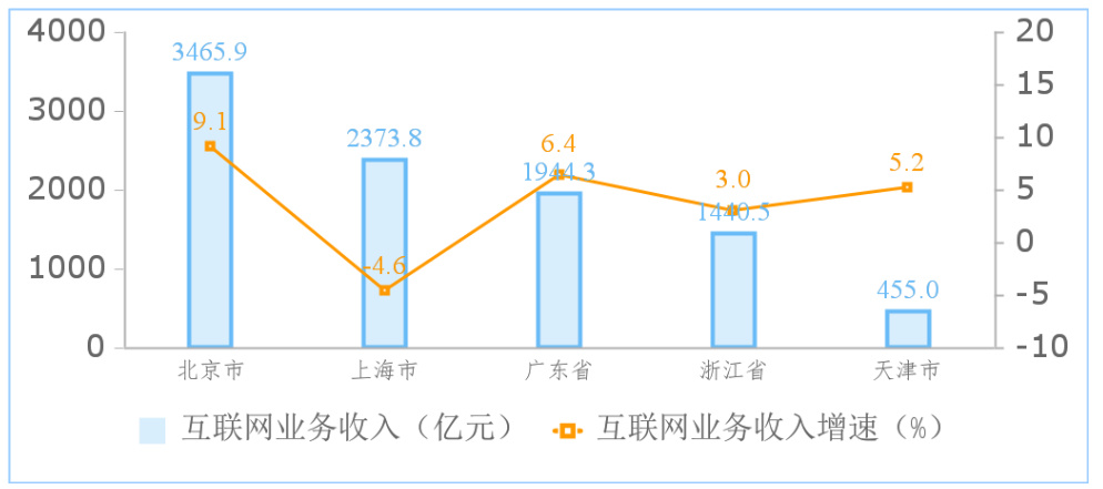 超半数地区互联网业务收入实现增长。1-8月份,互联网业务累计收入居前5名的北京(增长9.1%)、上海(下降4.6%)、广东(增长6.4%)、浙江(增长3%)和天津(增长5.2%)共完成业务收入9679.5亿元,同比增长3.8%,占全国(扣除跨地区企业)互联网业务收入的82.7%。全国互联网业务收入实现正增长的省(区、市)有17个,其中甘肃、云南增速超80%,西藏、辽宁、吉林降幅超20%。