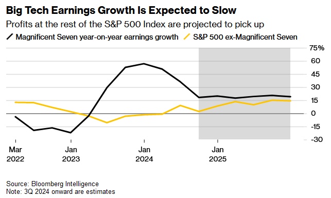 数据显示,分析师目前预计,在第三季度期间,“美股七巨头”成分股的盈利增幅将从上一季度的36%放缓至18%。Findlay Park Partners LLP首席执行官Simon Pryke表示:“从某种程度上说,美股‘七巨头(The Magnificent Seven)’的业绩增长都证明了它们的优异表现,但现在的盈利增长预期相当温和,而估值仍反映出强劲的增长模式会持续下去。其中肯定有一个是错误的。”