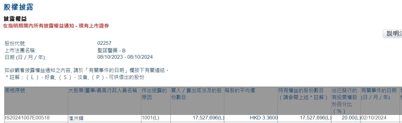 智通财经APP获悉,香港联交所最新资料显示,10月2日,潘洪辉增持圣诺医药-B(02257)1752.7696万股,每股作价3.36港元,总金额约为5889.31万港元。增持后最新持股数目约为1752.77万股,最新持股比例为20%。