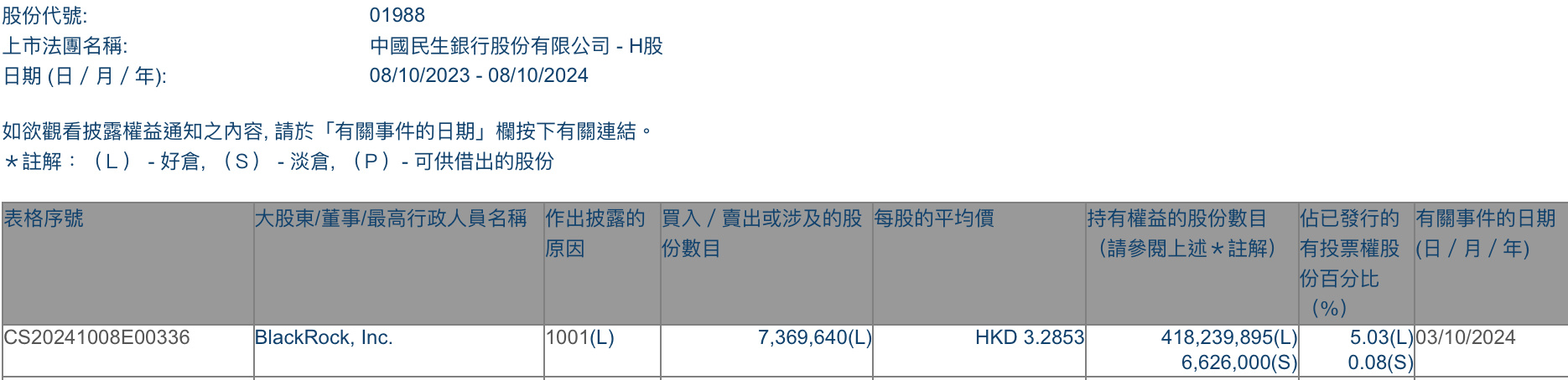 智通财经APP获悉,据香港联交所最新数据显示,10月3日,贝莱德增持民生银行(01988)736.964万股,每股作价3.2853港元,总金额约为2421.15万港元。增持后最新持股数目约为4.18亿股,最新持股比例为5.03%。