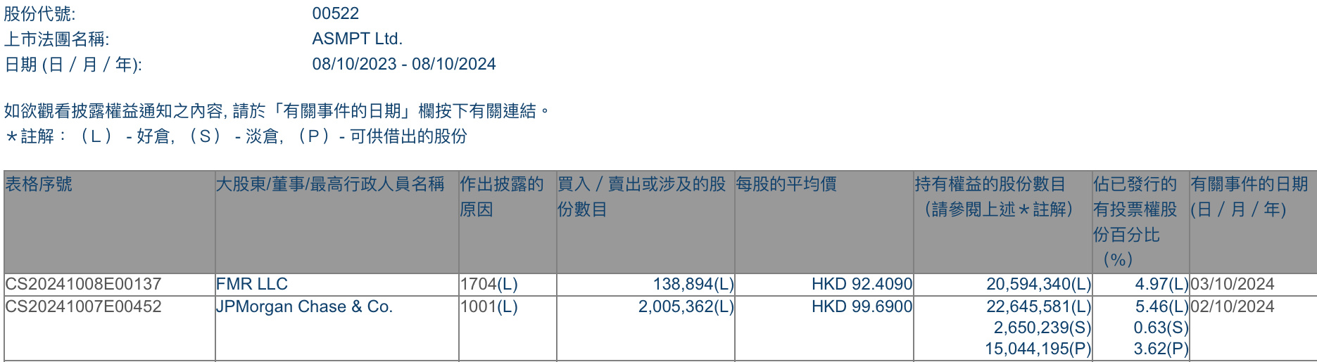 智通财经APP获悉,据香港联交所最新数据显示,10月2日,小摩增持ASMPT(00522)200.5362万股,每股作价99.69港元,总金额约为1.999亿港元。增持后最新持股数目约为2264.56万股,持股比例为5.46%。