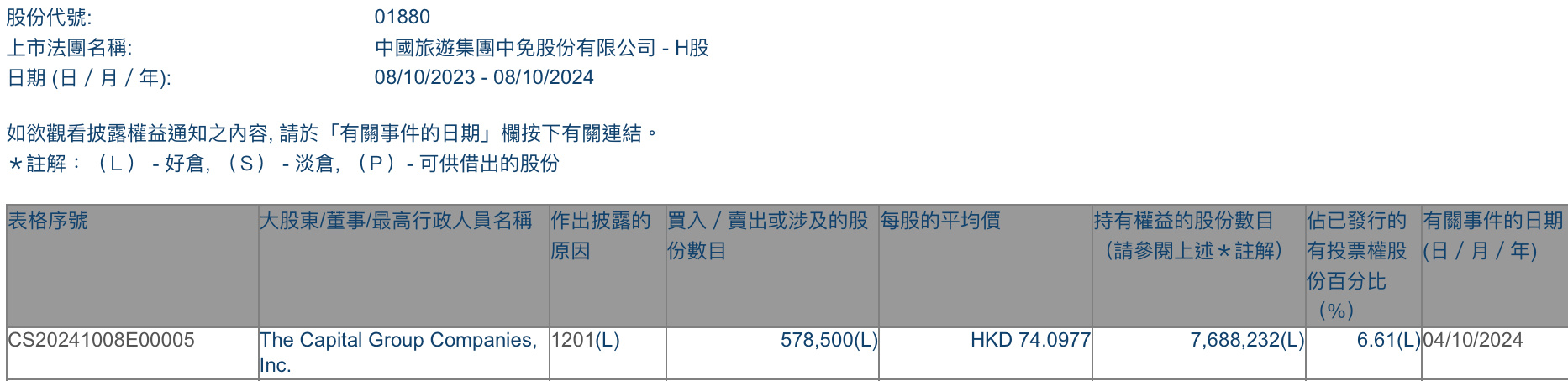 智通财经APP获悉,香港联交所最新资料显示,10月4日,美国资本集团减持中国中免(01880)57.85万股,每股作价74.0977港元,总金额约为4286.55万港元。减持后最新持股数目约为768.82万股,最新持股比例为6.61%。