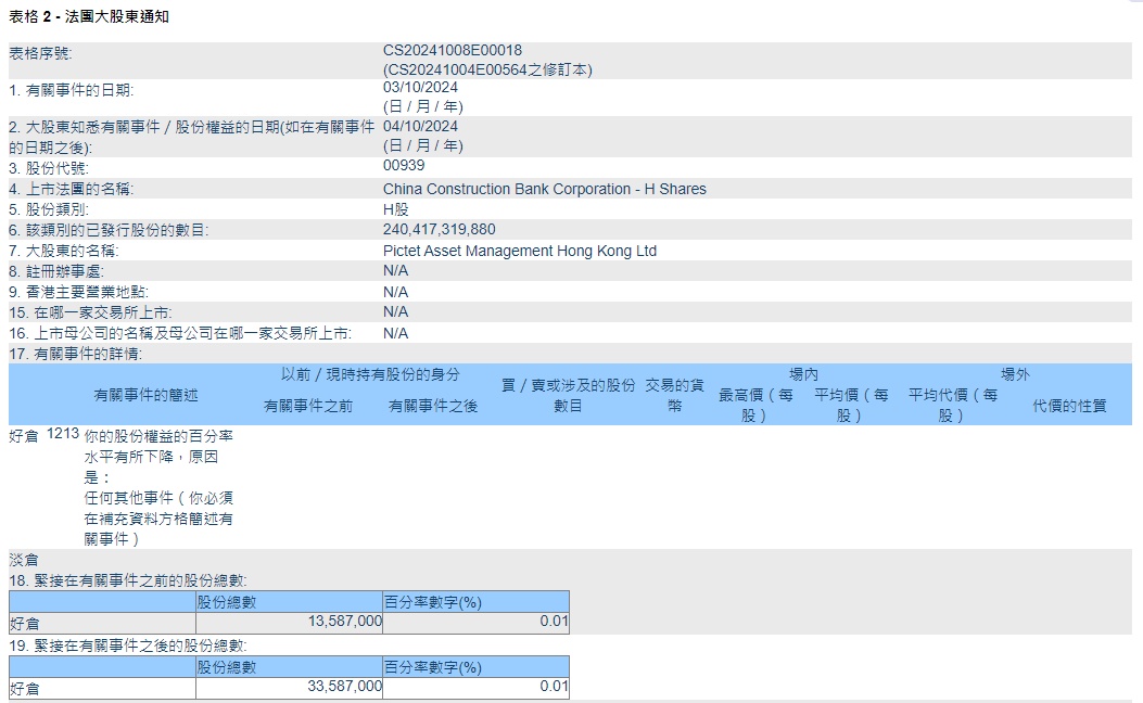 “乌龙”修正!瑞士百达增持建设银行(00939)H股2000万股 而非200亿股