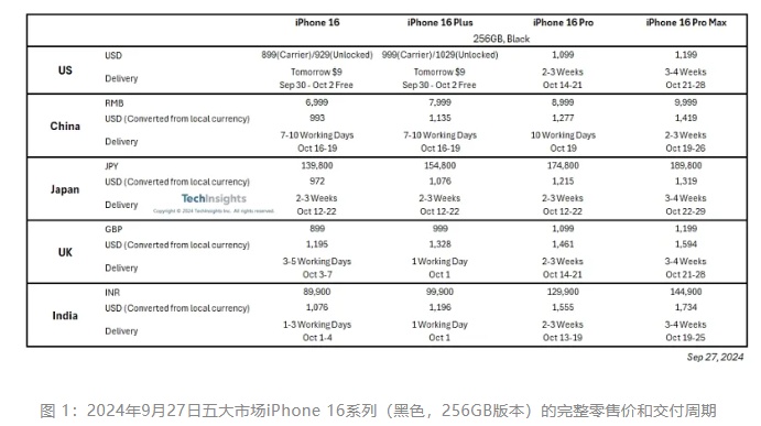按周计算,除日本外,其他四个国家的iPhone 16和16 Plus交货周期均有所缩短,一周前为7-10个工作日。相比之下,iPhone 16 Pro和 Pro Max的交货时间相近甚至更长,这表明美国对16 Pro和日本对16 Pro Max的需求增加。