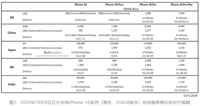 在上市窗口期的第二周,这一趋势仍在继续,iPhone 16和16 Plus在一线市场的需求开始减少,其发货周期比去年同期缩短了1-2周。与此同时,iPhone 16 Pro 和16 Pro Max的发货周期每周基本保持稳定。