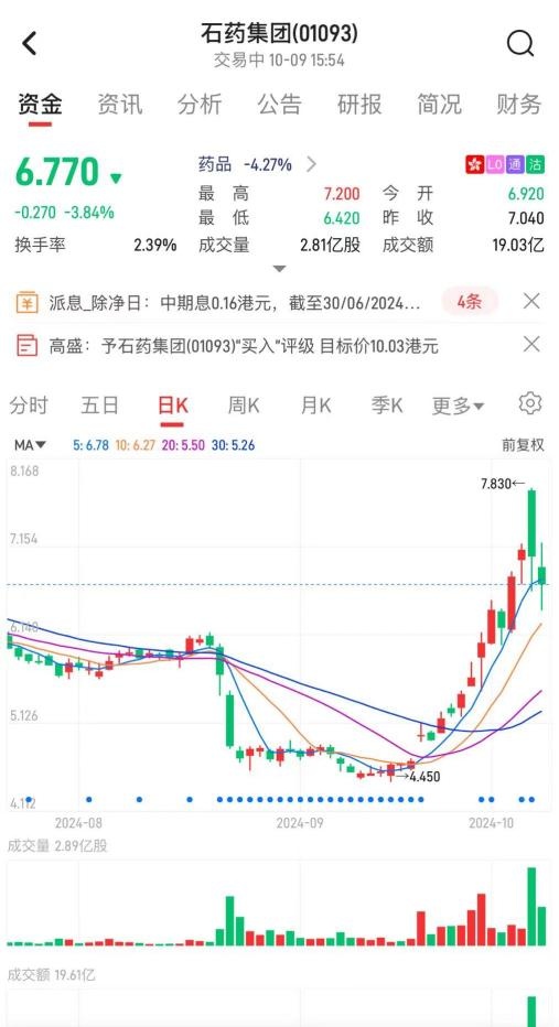 自9月中旬以来,石药集团的股价开启了一波凌厉的升势。不到一个月的时间里,石药集团股价最高触及7.83港元,较9月16日盘中低点的4.45港元足足飙涨了76%。不过,或受近日港股大盘回调影响,叠加石药集团短期内本已收获较大涨幅,获利盘有一定兑现需求,近两个交易日该公司的股价走势有所“降温”。