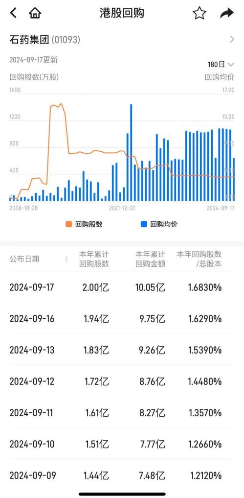 而就石药集团来说,公司目前的价格显然也值得投资者动心。一个最有力的证据便是,继今年前9月已回购超10亿港元的基础上,石药集团于9月下旬宣布将在未来两年内增加回购50亿港元,且回购股份均将被注销。