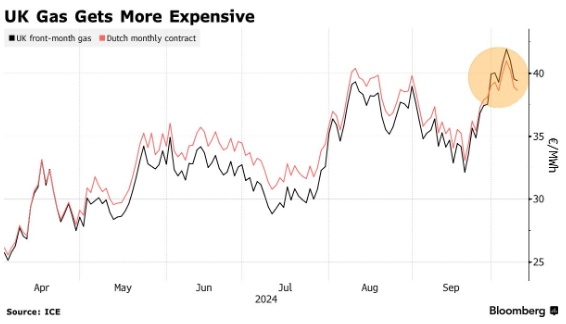 根据彭博汇编的船舶跟踪数据,与2023年的水平相比,1月至9月运往英国的液化天然气(LNG)出货量减少了一半以上。欧盟提高了液化天然气的进口能力,这减少了对来自英国的供应需求,同时英国电力行业的国内天然气使用量也大幅下降。
