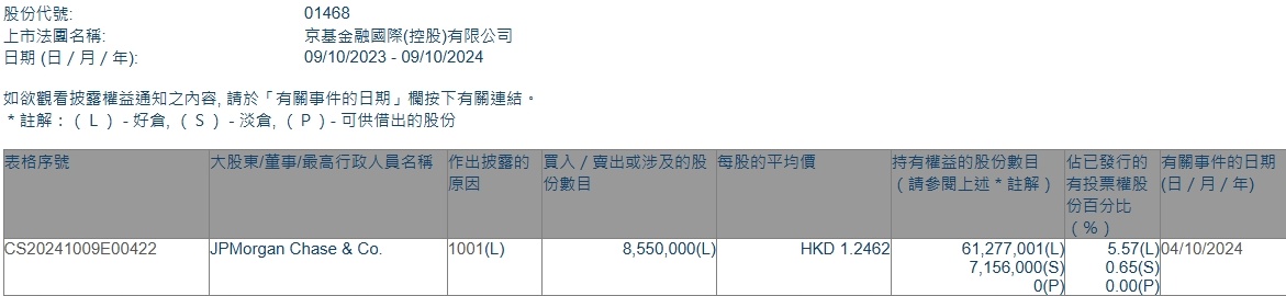智通财经APP获悉,据香港联交所最新数据显示,10月4日,摩根大通增持京基金融国际(01468)855万股,每股作价1.2462港元,总金额约为1065.5万港元。增持后最新持股数目约为6127.7万股,持股比例为5.57%。