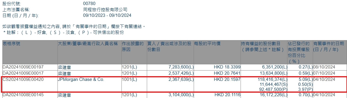 智通财经APP获悉,香港联交所最新资料显示,10月4日,小摩增持同程旅行(00780)236.7639万股,每股作价20.1597港元,总金额约为4773.09万港元。增持后最新持股数目约为1.18亿股,最新持股比例为5.09%。