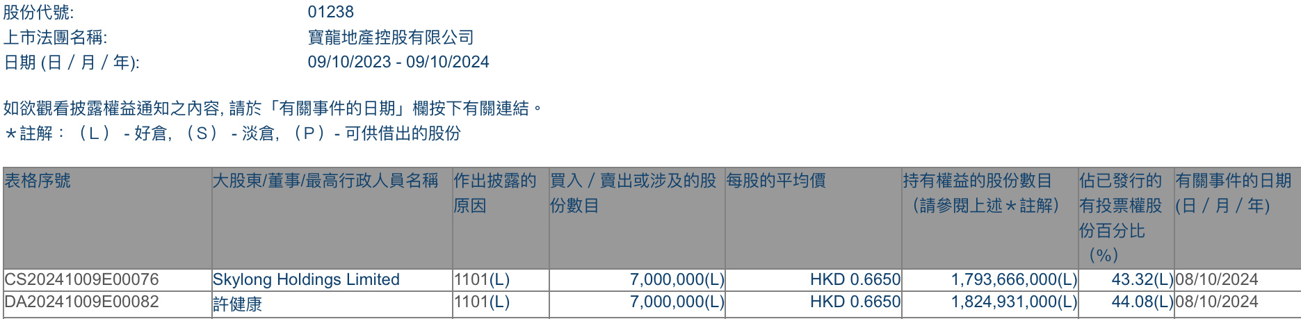 智通财经APP获悉,香港联交所最新资料显示,10月8日,Sky Holdings Limited增持宝龙地产(01238)700万股,每股作价0.665港元,总金额约为465.5万港元。增持后最新持股数目约为17.94亿股,最新持股比例为43.32%。
