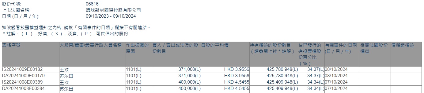 智通财经APP获悉,据香港联交所最新数据显示,10月7日-10月8日,苏尔田连续两日合计增持环球新材国际(06616)77.1万股,总金额约为328.57万港元。增持后最新持股数目约为4.26亿股,持股比例为34.37%。