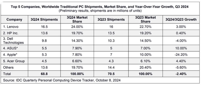2024年第三季度,联想位居榜首,全球出货量达到1650万台,同比增长3%,这得益于2023年第三季度后,联想出货量持续强劲。惠普紧随其后,全球出货量为1350万台,与去年同期持平。戴尔保持第三位,其出货量同比下降4%至980万台。华硕位列第四,凭借16%的同比增长成为头部厂商中增速最快的厂商。苹果(AAPL.US)则排在第五,出货量为530万台,同比下降24%。