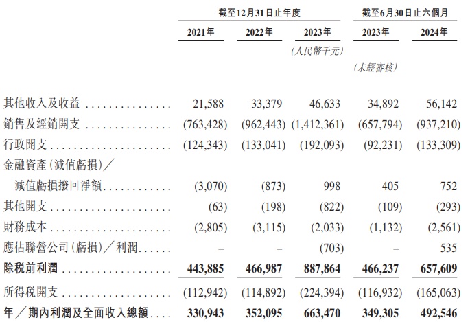 财务方面,于2021年、2022年、2023年及2024年截至6月30日止六个月,毛戈平实现收入分别约为15.77亿元、18.29亿元、28.86亿元、19.72亿元人民币;同期,该公司期内利润及全面收入总额分别约为3.31亿元、3.52亿元、6.63亿元、4.93亿元人民币。