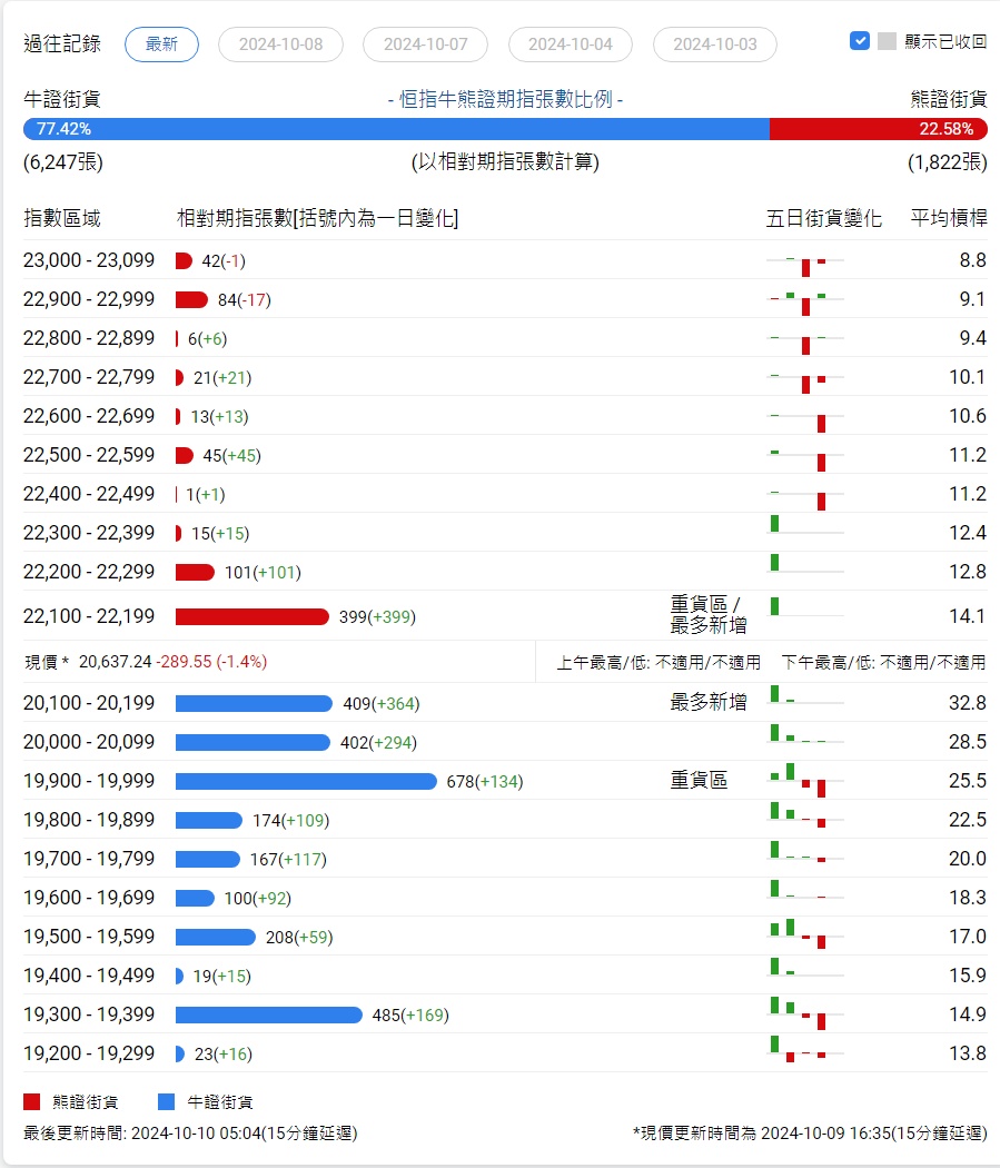 智通财经APP获悉,截至10月10日,恒指最新的牛熊街货比例为77:23。