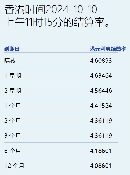 智通财经APP获悉,10月10日,港元拆息几乎全线上升,但一个月期下跌。隔夜息回升19基点至4.60893%,而与楼按相关的一个月拆息则连跌两天,报4.41524%,为10月2日后最低。反映银行资金成本的三个月拆息结束两连跌,微升至4.36119%。长息方面,六个月及一年期分别升至4.18601%和4.08601%。