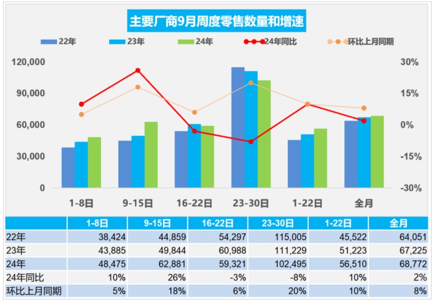 9月第三周乘用车市场日均零售5.9万辆,同比去年9月同期下降3%,较上月同期增长6%。