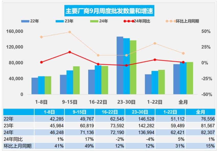 9月第四周乘用车厂商批发日均13.7万辆,同比去年9月同期下降4%,环比上月同期增长12%。