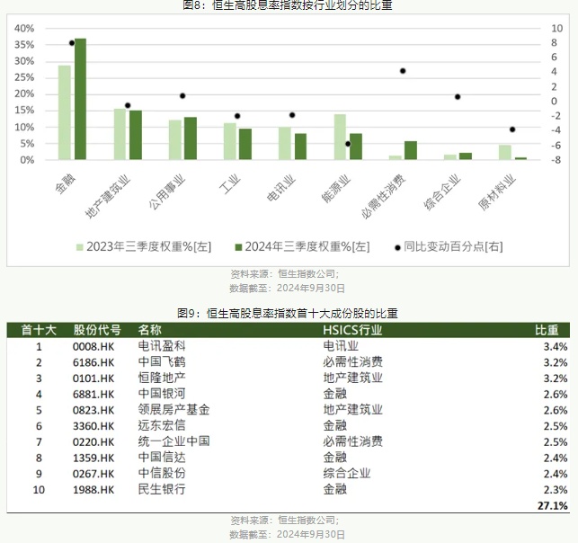 整体而言,恒生高股息率指数的指数编算方法显示出指数紧贴不断变化环境,从而维持高股息率及低波辐率的特点。截至2024年第三季度,首三大行业为金融业(37%权重)、地产建筑业(15%权重)和能源业(13%权重)(图8)。与去年同期相比,金融业增幅最大达8.0个百分点至37%。相比之下,能源业跌幅最大,下跌5.8个百分点至8%。排名前10的成份股权重合共达27.1%(图9)。