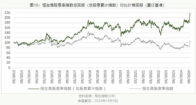 自2013年3月以来至截止2024年10月4日的长远期间内,恒生高股息率指数录得+8.6%的价格回报,而总回报(价格回报+股息回报)为+132.0%(图10),以年化基准计算价格回报为+0.7%,年化复合股息回报率约为+7.0%,而整体年化总回报为+7.7% [= 7.0% +0.7%]。换句话说,恒生高股息率指数期间内的总回报源自股息再投资回报加上价格收益。