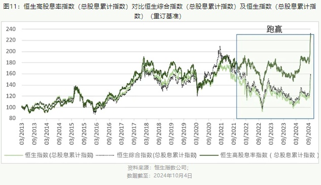 从长远角度来看,自2013年3月以来(截至2024年10月4日),恒生高股息率指数录得132.0%的总回报(年化总回报率为+7.7%),以年化基准计算跑赢大市(恒生综合指数年化总回报率为+4.4%)约3.4个百分点(图11)。恒生高股息率指数有较低的年化波动率17.8%,相比恒生综合指数为20.9%;其经风险调整的总回报(年化总回报/年化波动)为0.44倍,高于恒生综合指数的0.21倍。