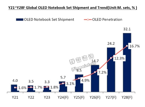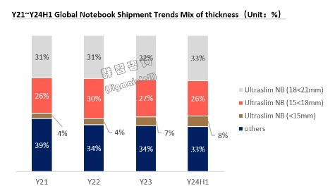 群智咨询(Sigmaintell)数据显示,全球小于18毫米厚度笔记本电脑的市场份额展现出持续的稳定性,稳定维持在大约34%的水平。与此同时,一个显著的趋势是,厚度小于15毫米的轻薄型笔记本市场份额持续攀升。特别值得一提的是,自2023年前后,随着OLED技术在笔记本电脑领域的广泛引入与增长,这一增长势头得到了进一步的推动与强化。随着OLED笔记本设计的不断优化以及品牌厂商对OLED技术优势的积极推广,预计OLED轻薄笔记本电脑的性能将得到更充分的展现,市场潜力有望进一步释放。