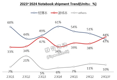群智咨询(Sigmaintell)有关中国区笔电线上市场零售数据显示,中国区线上市场正经历一场变革,其中游戏本品类以其卓越的性能表现成为市场瞩目的焦点。这些专为游戏爱好者打造的高性能笔记本,凭借强大的处理器、高速的显卡以及优化的散热系统,逐步在消费者心中树立了不可替代的地位,并悄然侵蚀着以往由轻薄本主导的市场份额。