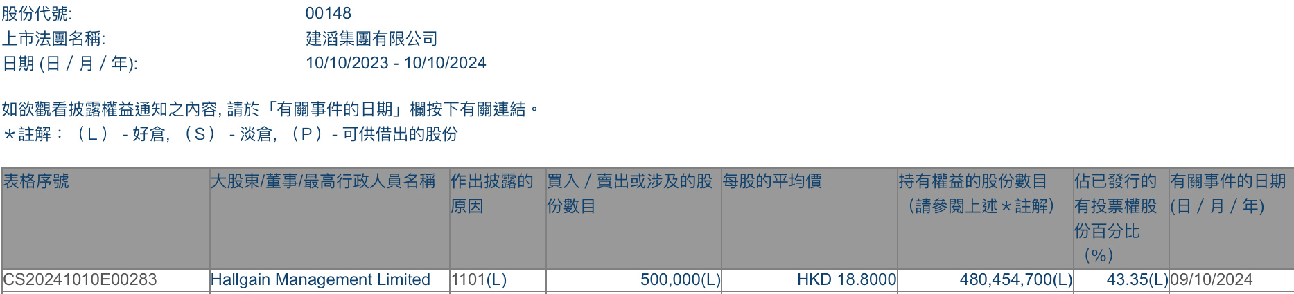 智通财经APP获悉,香港联交所最新资料显示,10月9日,Hallgain Management Limited增持建滔集团(00148)50万股,每股作价18.8港元,总金额为940万港元。增持后最新持股数目约为4.805亿股,最新持股比例为43.35%。