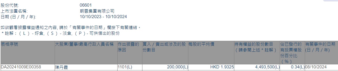 智通财经APP获悉,香港联交所最新资料显示,10月8日,陈丹霞增持朝云集团(06601)20万股,每股作价1.9325港元,总金额为38.65万港元。增持后最新持股数目为449.35万股,最新持股比例为0.34%。