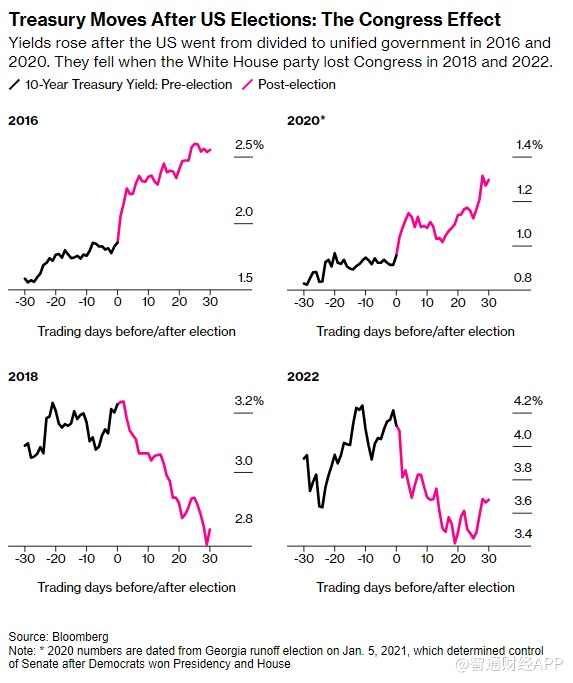 嘉信理财首席固定收益策略师Kathy Jones表示:“国会的组成非常重要。在竞选活动中,你可以说任何你想说的话——他们也确实这么做了。但是总统需要国会通过立法。”