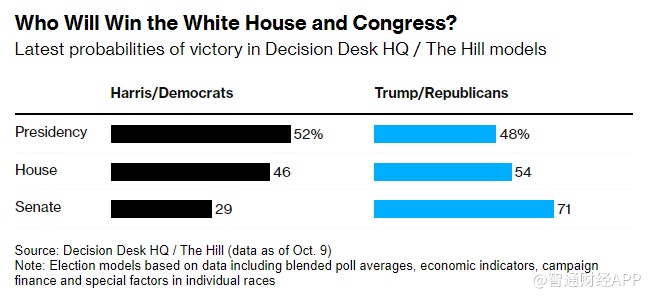 投资者正对11月5日的选举结果进行预测。民意调查显示,共和党将赢得参议院,而众议院的胜负难分,特朗普和哈里斯势均力敌。