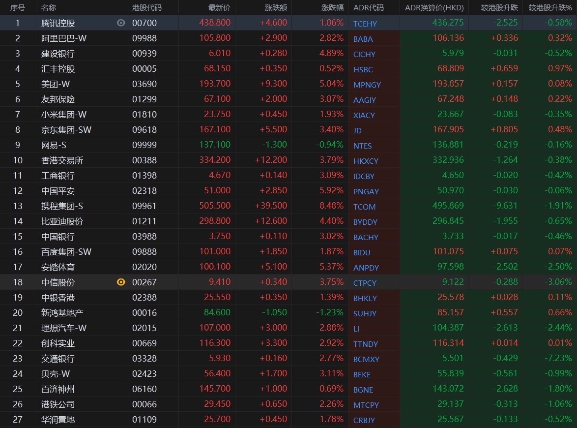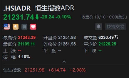 智通财经APP获悉,周四美股三大指数集体下跌,恒生指数ADR下跌,按比例计算,收报21231.74点,较香港收市下跌20.24点或0.1%。
