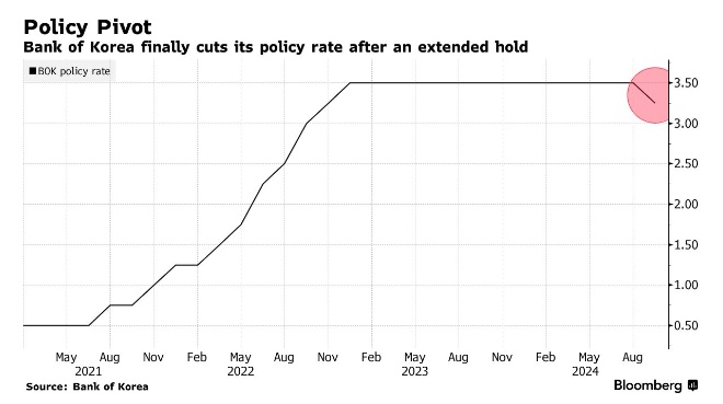 随着其政策转向,韩国央行加入了全球越来越多央行放松货币政策的行列,以在通胀压力降温的情况下重振经济势头。上个月,美联储将关键利率下调了50个基点,以确保经济软着陆优先于抗击通胀。