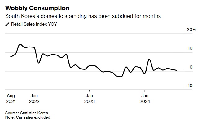 韩国国内生产总值在2024年初出现强于预期的增长后,第二季度意外萎缩。投资下降拖累经济活动,借贷成本上升和消费前景不确定损及情绪。尽管如此,政策制定者仍将经济增长下滑淡化为主要是暂时的。