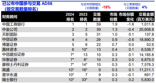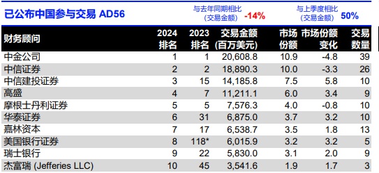 中金公司在2024年前三季度的“已公布中国参与并购交易”排行榜中名列前茅,市场份额为10.93%,相关交易总额为206亿美元。中信证券以10.02%的市场份额位居第二,中信建投以7.52%的市场份额位居第三。按交易数量排名,前三名分别是中国工商银行、中金公司和天职国际。