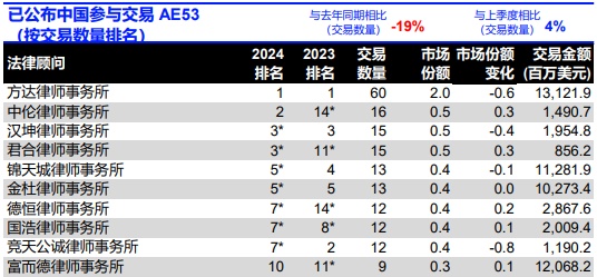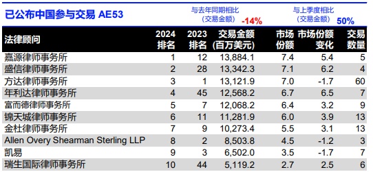 在法律顾问方面,嘉源律师事务所、盛信律师事务所和方达律师事务所在“已公布中国参与并购交易”排行榜中按交易总额排名前三。按交易数量排名,前三名分别是方达律师事务所、中伦律师事务所和汉坤律师事务所。
