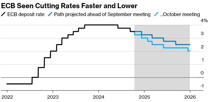 尽管货币市场仍预计欧洲央行将在下周降息25个基点,但他们对12月进一步降息的信心已经减弱。对终端利率的预期也有所上升,交易员现在预计到明年年底利率终值将超过2%,而一周前为1.75%。