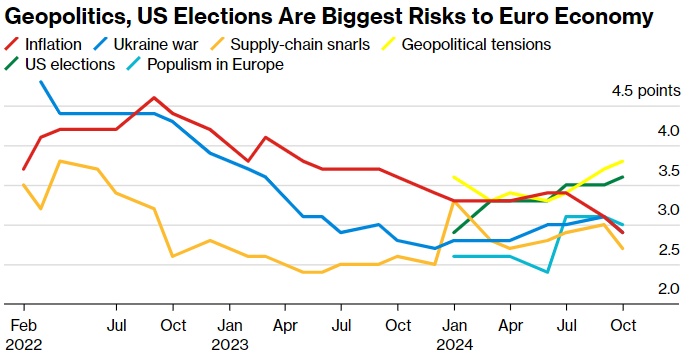 事实上,对家庭支出和投资复苏以及全球贸易回升的希望正在消退。最重要的是,受访者认为,欧洲最大的经济风险来自地缘政治紧张局势以及特朗普可能再次当选美国总统。有鉴于此,AlphaTerra Capital首席风险官Andreas Koutras认为欧洲央行“落后于形势”。