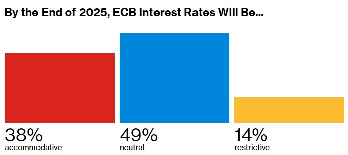 几乎一半的人认为到那时利率将处于中性水平,而大约五分之二的人预计利率将低到足以鼓励经济扩张。此前的调查预测,欧洲央行的降息周期将在2025年9月结束于2.5%。