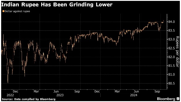 智通财经APP获悉,印度卢比兑美元首次跌破1美元兑84卢比的水平,原因是外国资金从印度股市和债市流出、以及印度央行放松鹰派立场给卢比带来了压力。截至发稿,卢比跌至1美元兑84.064卢比;日内一度跌至1美元兑84.0975卢比,为历史新低。