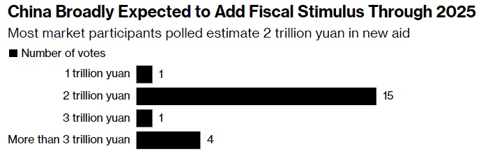 接受机构调查的大多数市场参与者预计,下一轮刺激措施将以政府债券的形式出台。除了任何财政方案的规模之外,支持目标还将表明,中国政府希望把这个全球第二大经济体引向强劲增长。