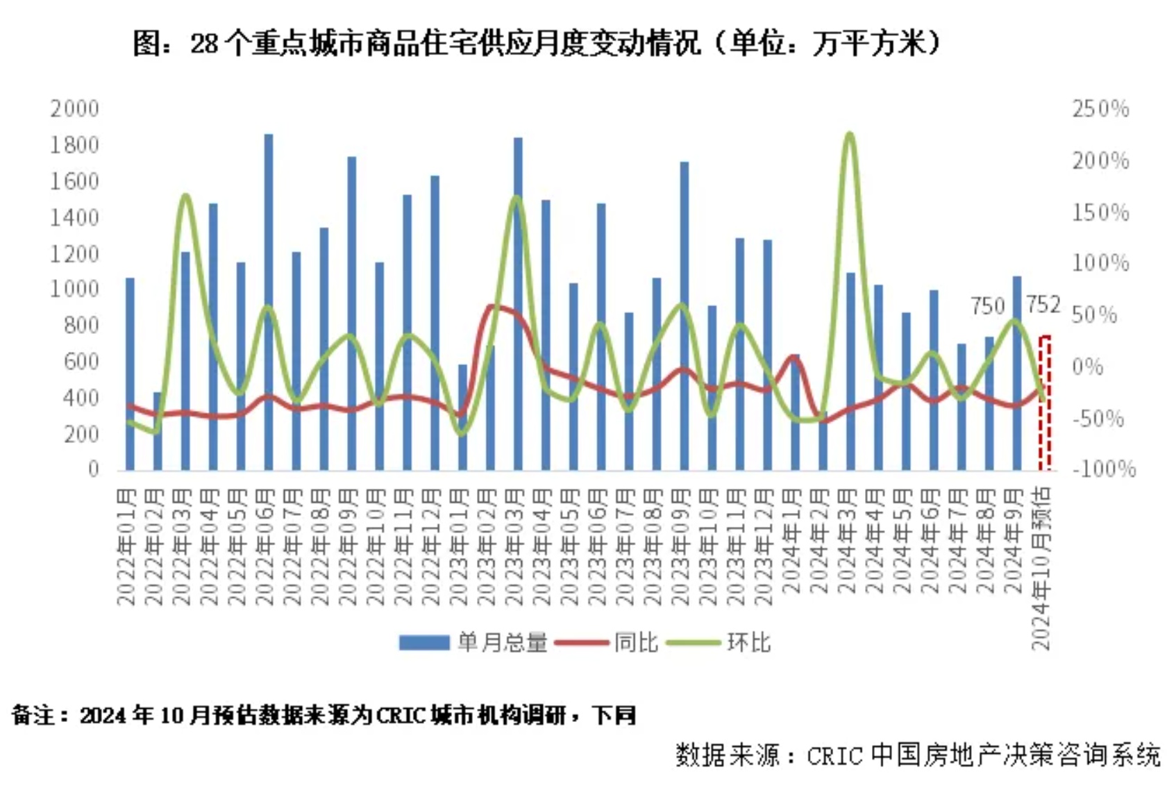 10月仍处于传统营销旺季,不过房企推盘积极性稳步回落,回落至8月水平。据CRIC调研,10月28个重点城市预计新增商品住宅供应面积752万平方米,环比下降31%,同比下降18%,绝对量回归至8月水平。