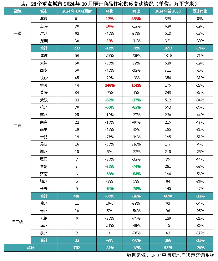 据CRIC调研,10月28个重点城市预计新增商品住宅供应面积752万平方米,环比下降31%,同比下降18%,绝对量回归至8月水平。仅一线同比保持正增31%,二线同环比跌幅显著,累计同比降幅达3成以上。