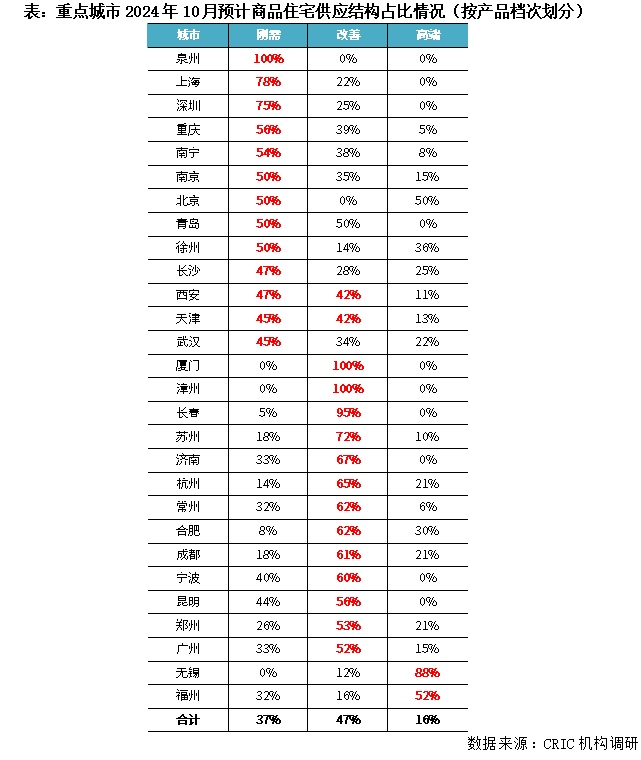 而从供应结构各产品档次分布来看,重点城市刚需、改善、高端占比结构为37%、47%和16%,呈现出以改善为主,刚需为辅的供应结构。