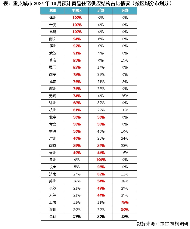 从供应结构各项目区域分布来看,重点城市主城、近郊、远郊占比结构为57%、30%和12%,本月供应重心仍集中在主城区,近郊次之,远郊最少。