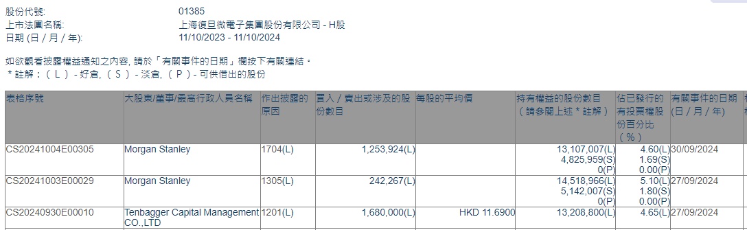 智通财经APP获悉,香港联交所最新资料显示,9月27日,Tenbagger Capital Management CO.,LTD减持上海复旦(01385)168万股,每股作价11.69港元,总金额为1963.92万港元。减持后最新持股数目为1320.88万股,最新持股比例为4.65%。