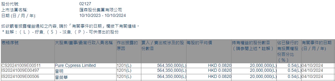 智通财经APP获悉,香港联交所最新资料显示,10月4日,Pure Cypress Limited减持汇森股份(02127)5.6435亿股,每股作价0.082港元,总金额为4627.67万港元。减持后最新持股数目为2000万股,最新持股比例为0.54%。