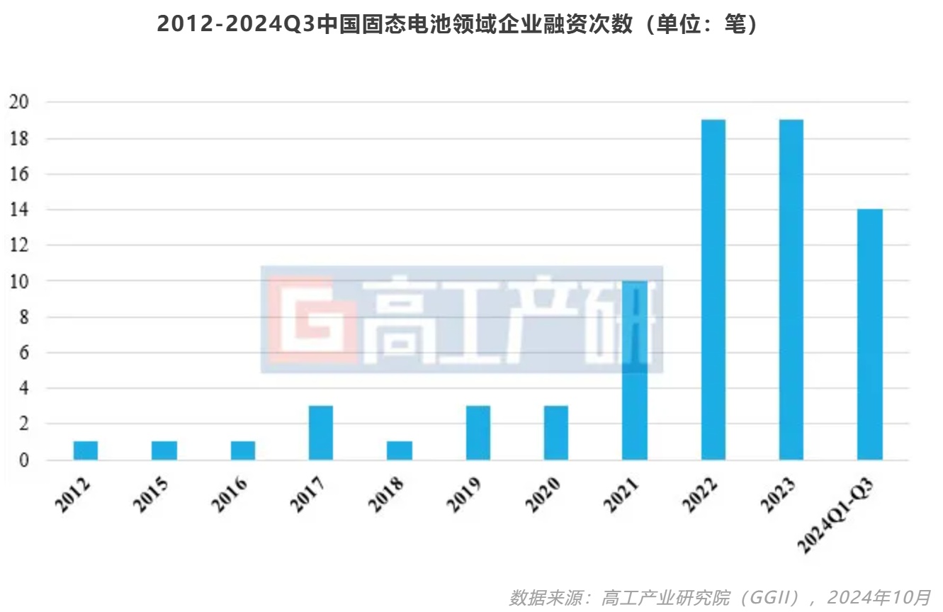 智通财经APP获悉,GGII发文称,自2021年起国内固态电池赛道开始受到市场关注,企业开启融资竞赛,至今仍在持续升温。据GGII不完全统计,截至2024年9月底,国内已有24家固态电池领域企业(含固态电池、固态电解质、正极材料等,下同)共完成75笔融资。其中2022和2023年均完成19笔融资,约为2021的两倍;2024年前三季度已完成14笔融资,约占2023年的3/4。