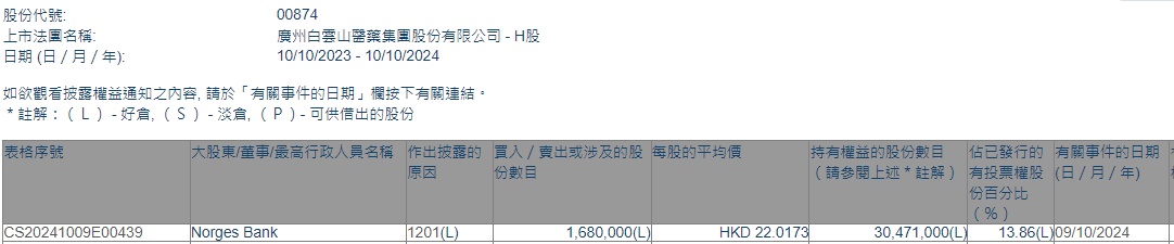 Bank减持白云山(00874)168万股,每股作价22.0173港元,总金额约为3698.91万港元。减持后最新持股数目为3047.1万股,最新持股比例为13.86%。
