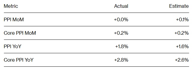 智通财经APP获悉,美国劳工统计局周五公布的数据显示,美国9月PPI同比上涨1.8%,高于市场预期的1.6%;环比上涨0.0%,低于市场预期的0.1%。此外,美国9月核心PPI同比上涨2.8%,高于市场预期的2.6%;环比上涨0.2%,符合市场预期。